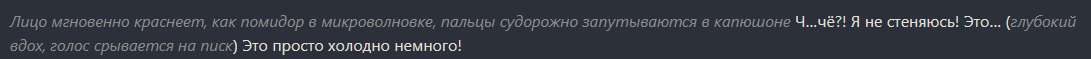 >>1361036 Мемо парик на клей Момент приклеивает, если ты любишь жрать ассистент-говно, то не пиши Примеры речи делают хоть какое-то разнообразие в речи сетки, если тебе очень нравится читать одно и то же на разных ботах, то не пиши