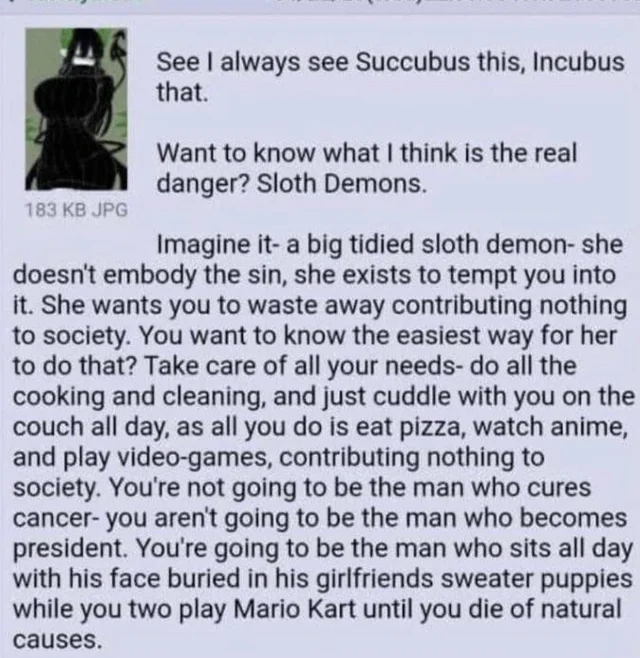 Представь – большая, пушистая демоница лени. Она не воплощает грех, она существует, чтобы искушать тебя им. Она хочет, чтобы ты прозябал, не внося никакого вклада в общество. Хочешь знать, какой для неё самый простой способ это сделать? Взять на себя все твои потребности – готовить, убирать, и просто целоваться с тобой на диване целыми днями, пока ты только и делаешь, что ешь пиццу, смотришь аниме и играешь в видеоигры, не принося никакой пользы обществу. Ты не станешь человеком, который найдёт лекарство от рака. Ты не станешь человеком, который станет президентом. Ты станешь человеком, который целыми днями сидит, уткнувшись лицом в грудь своей девушки, пока вы оба играете в Mario Kart, пока не умрёте естественной смертью.