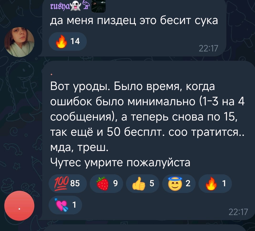 >>1361139 Чаю, у меня с новой обновой еще и думалка к хуям сломалась и она дублировалась в чате, ремиксер как обычно обосрался, а потом на дядю жору гонит