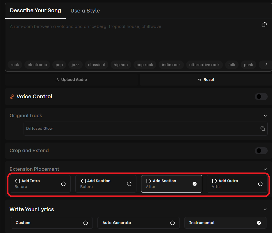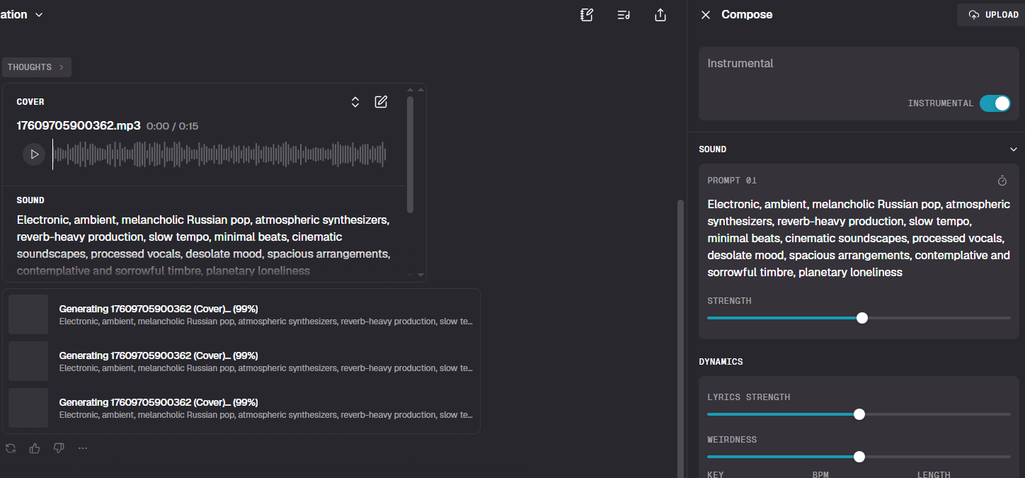 >>1395222 >пишу чтобы сгенерил с таким же припевом >>1395251 >image.png включена галка "инструментал" >почему не генерит? не юзай чатик. делай всё через COMPOSE тебе надо загнать кусок текста что есть куда-нибудь в чатгпт или дипсик и попросить сгенерить полную песню. дальше. заливаешь в компос кусок, закидываешь промты и выбираешь extend, а не кавер. ползунками крути откуда начинать и в какую сторону экстенд.