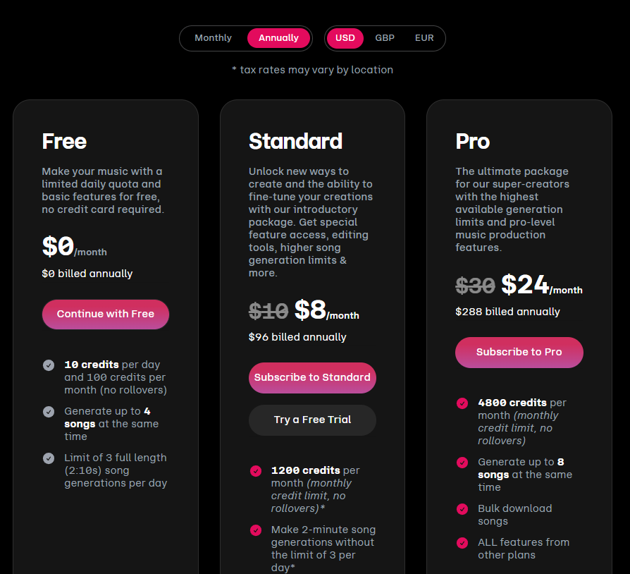 Вышла версия 1.5 Allegro, по функционалу то же, что и 1.5, только в два раза быстрее. Лимит 400 кредитов в месяц (или 200 генераций по 33 секунды каждая) при условии ежедневного захода на сайт - 100 кредитов даются в месяц, и еще 10 кредитов даются ежедневно. Также можно фармить кредиты, выполняя специальные задания по оцениванию качества рандомных треков, это дает не больше 10 дополнительных кредитов в день. Для большего числа кредитов и более продвинутых фич типа инпэйнтинга или генерации с загруженного аудио нужно платить. Появилась возможность генерировать треки по 2 минуты 11 секунд, не больше 3 длинных треков (по 2 версии на каждый трек) в день на бесплатном тарифе.