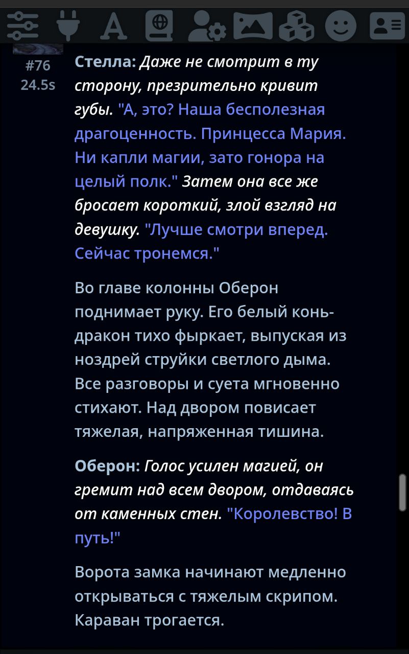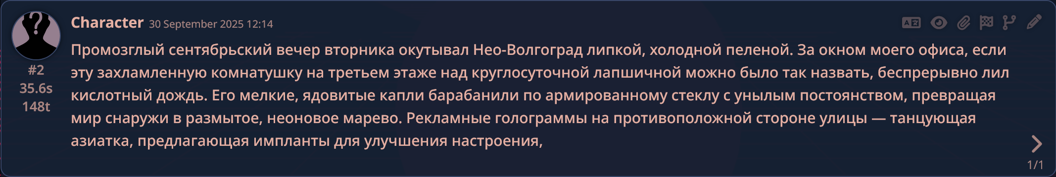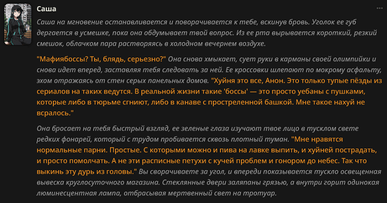 В пресете есть 3 варианта длины ответов: короткие, долгие, микс в зависимости от сцены. Выбрал микс, из-за сцены разговора ответы были мелкие. Давно не играл с короткими ответами. Раньше нравилось, сейчас обленился, поэтому решил поиграть с такими. Слоубёрн с короткими ответами самое то.