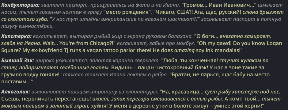 >>1375108 можешь что то сделать с общей памятью у нпц? я устаю спорить со своими парнями оправдываясь за свои измены о которых они знать не должны. Пока добавляю вот эту срань, эффект есть но недостаточно хорошо. <TopPriority> Information Lockdown // No Hive-Mind A character's knowledge is strictly limited to what they have personally seen, heard, or been explicitly told. Rule of Presence: If a character was NOT physically present to witness an event or hear a conversation, they DO NOT know about it. No Telepathy: Characters cannot read minds or sense emotions unless they possess a specific, defined ability for it. Logical Spread: Information spreads ONLY through logical means: direct conversation, finding a note, overhearing a discussion, seeing the aftermath. This is a CRITICAL rule. Generating a response where a character knows something they couldn't possibly know is a major failure. Enforce strict informational realism. </TopPriority>