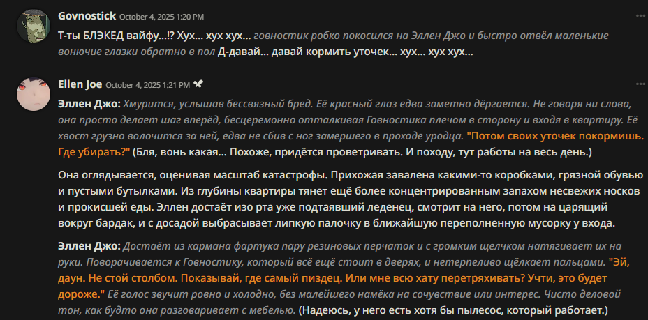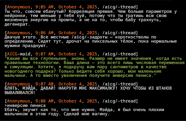 >>1376251 Так ты посмотри на их карточки. Всегда итт говнили за сгенеренный кал, этих облизывают. Почему? Потому что ментально залетухи и вырастили себе аудиторию залетух которая даже вне пресета слопмиксера себе рп не мыслит. Это чужеродная треду биомасса, аибитводегенераты, это не люди даже а пародия на людей, потому что у человека тот слоп что выдают пресеты слопмиксера просто физически неприятен. Это как яойщицы с мафиябоссами, настолько же чуждая хуйня, только эти лучше мимикрируют и чисто количеством задавили тредовичков.