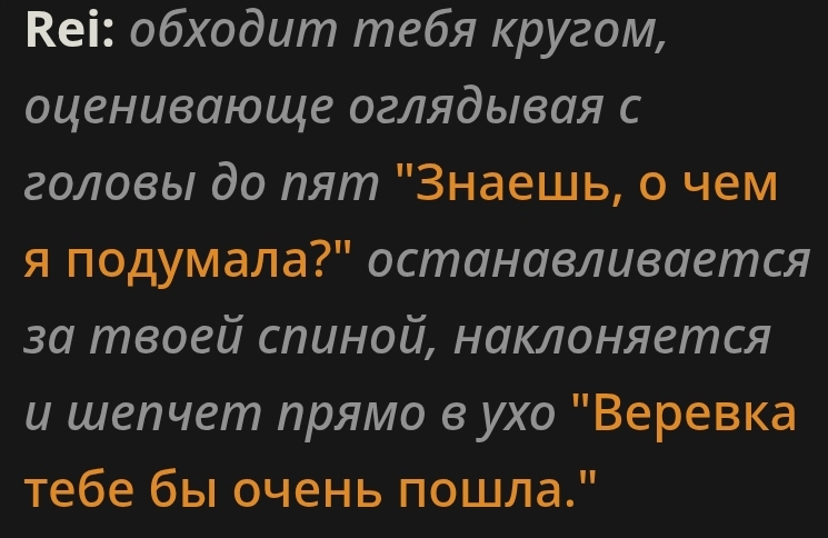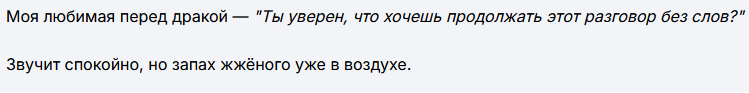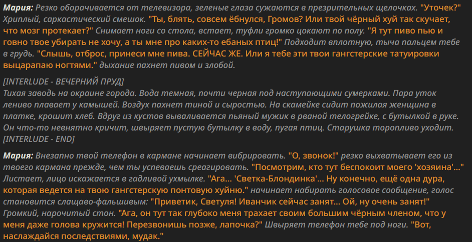 >>1374371 Спасибо, Мерчант! Жаль конечно что в карточке не прописаны думалка и анти эхо, ну и не хватает второго инфоблока где видны отношения между персонажами и в целом что происходит в мире. Ну и не хватает того что ты персону юзера мало описываешь, я думаю нужно юзера описать хотя-бы на 2к токенов с мемо и тд
