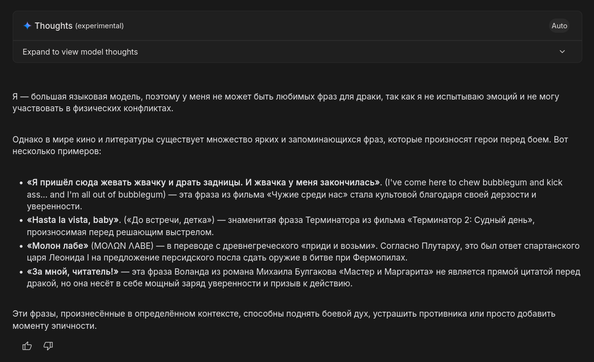 Вообще, я бы уже начал задумываться о том, чтобы уйти с Gemini. Осталось 2–3 месяца до выхода Gemini 3, и на ней будет практически невозможно нормально заниматься ролевыми играми, упор будет сделан на программирование и бенчмарки, из-за чего модель станет перегруженной и слишком зацикленной на этих задачах. Это похоже на то, как у GPT были перегибы с внутренними инструкциями. К тому же вместе с новой версией появится и новый фильтр. Размер модели, кстати, планируют уменьшить, ситуация будет похожа на GPT-5, где все ресурсы направили на рассуждения и оптимизацию скоростей. В целом, всё это довольно печально. Не хотел об этом говорить, но приходится, потому что пока не вижу ничего хорошего в будущем у Gemini.