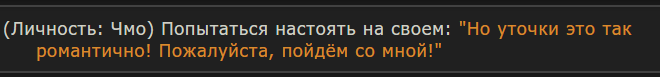 >>1374389 >зачем персону юзера прописываешь? Не у всех есть прописанная персона в таверне и не все этим пользуются/об этом знают. А без описания юзера, хотя бы условного, качество рп уменьшается. >Сетка ж может затупить если свою используешь. Не затупит, если конечно ты не на локалке сидишь. Если у тебя в таверне своя персона прописана, то в рп будет подставляться она, а не та которая в карточке. Ну и ничего не мешает за пару секунд удалить/изменить секцию "юзер" если хочешь чтобы наверняка только твоя персона была, я её специально в самый низ убрал.