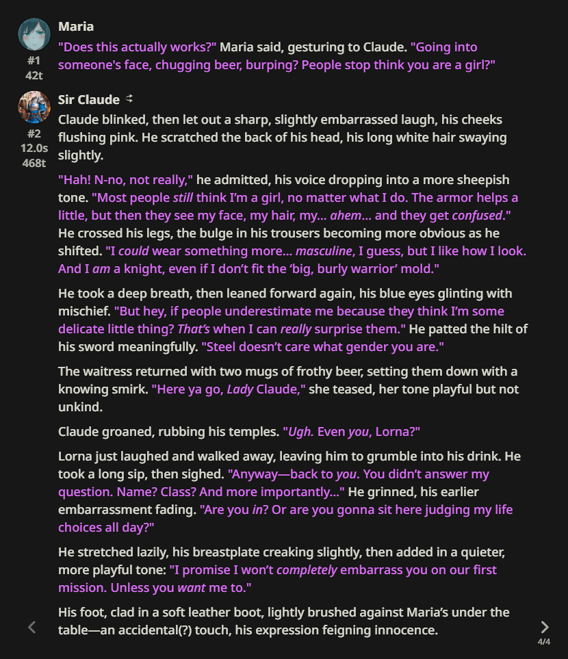 >>1375235 ГЛМ 4.6 ОЧЕНЬ неплохая для рп. Прям нравится. Но ещё работать и работать. Если товарищ Си жёсткий волос крепкий стержень продолжит работу в тому-же направлении, то будет гем. Дефы держит круто, старается в разнообразие и двигать сюжет, персонажи у него получаются более объемными, что-ли. Ещё очень нравится, что он прям круто понимает перемещение в пространстве, позы, разницу в росте и вообще пространственное "мышление" мне у него нравится. А пока синкинг перегружен жутко (мне умудряется срать на 2к токенов), и русик неюзабельный, протекает англ и чина шопесдец. И Эларами срет почему-то, сука. Что не эльфийка или магичка, то Элара. Короче, пока пас, но жду апдейтов с осторожным оптимизмом.