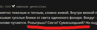 вообще я бы уже искал куда съебаться с гемини, осталось 2-3 месяца до выхода гемини 3, на ней будет невозможно рпшить из за сильного дроча на кодерство и бенчмаксинг, её просто нахуй мозги выжгут. как на гпт они надрачивают сетки "внутренними" инструкциями. там еще фильтр вместе с ней новый появится. размер кстати у неё уменьшат, будет похожая ситуация с гпт 5, чисто на ризонинг все средства будут направленны, и на оптмизацию скоростей. в общем, довольно печально дальше, не хотел говорить но приходится, потому что не вижу чего то хорошего на гемини дальше.