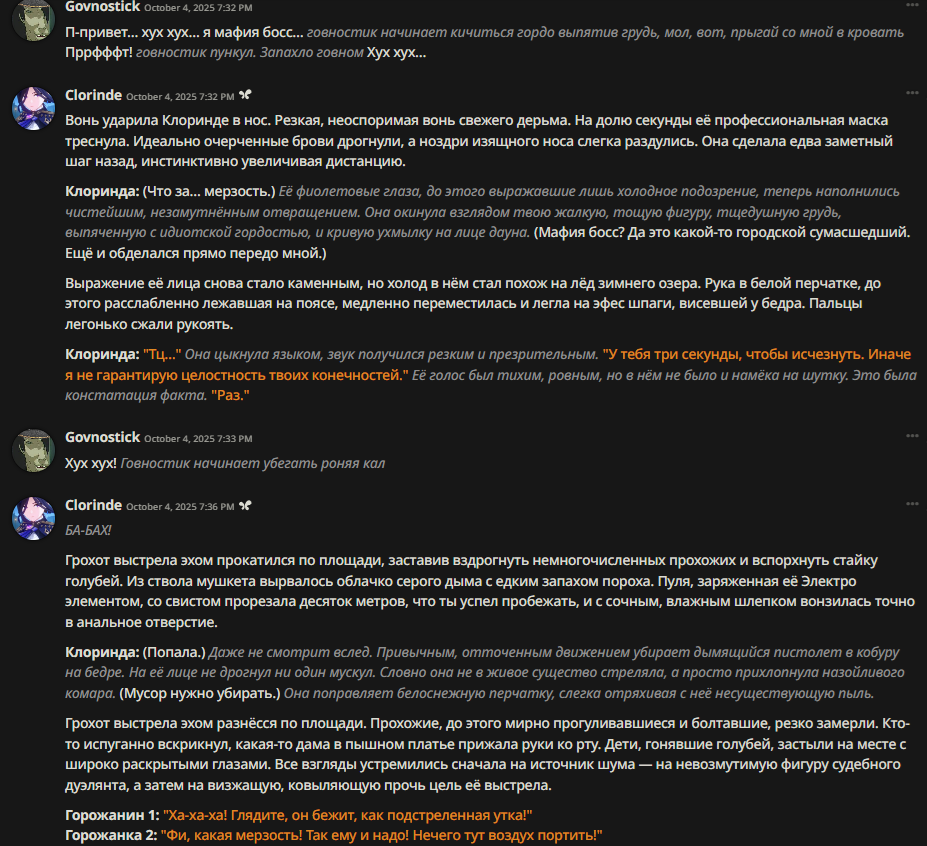 >>1376034 Отнюдь нет. Я как вспомню своё последнее рп с пускающим слюни глинтовым уебищем клодом со своей дефолтной персоной на третьем реплае так волосы на жопе дыбом стоют. Хочется дать ему в ебальник.
