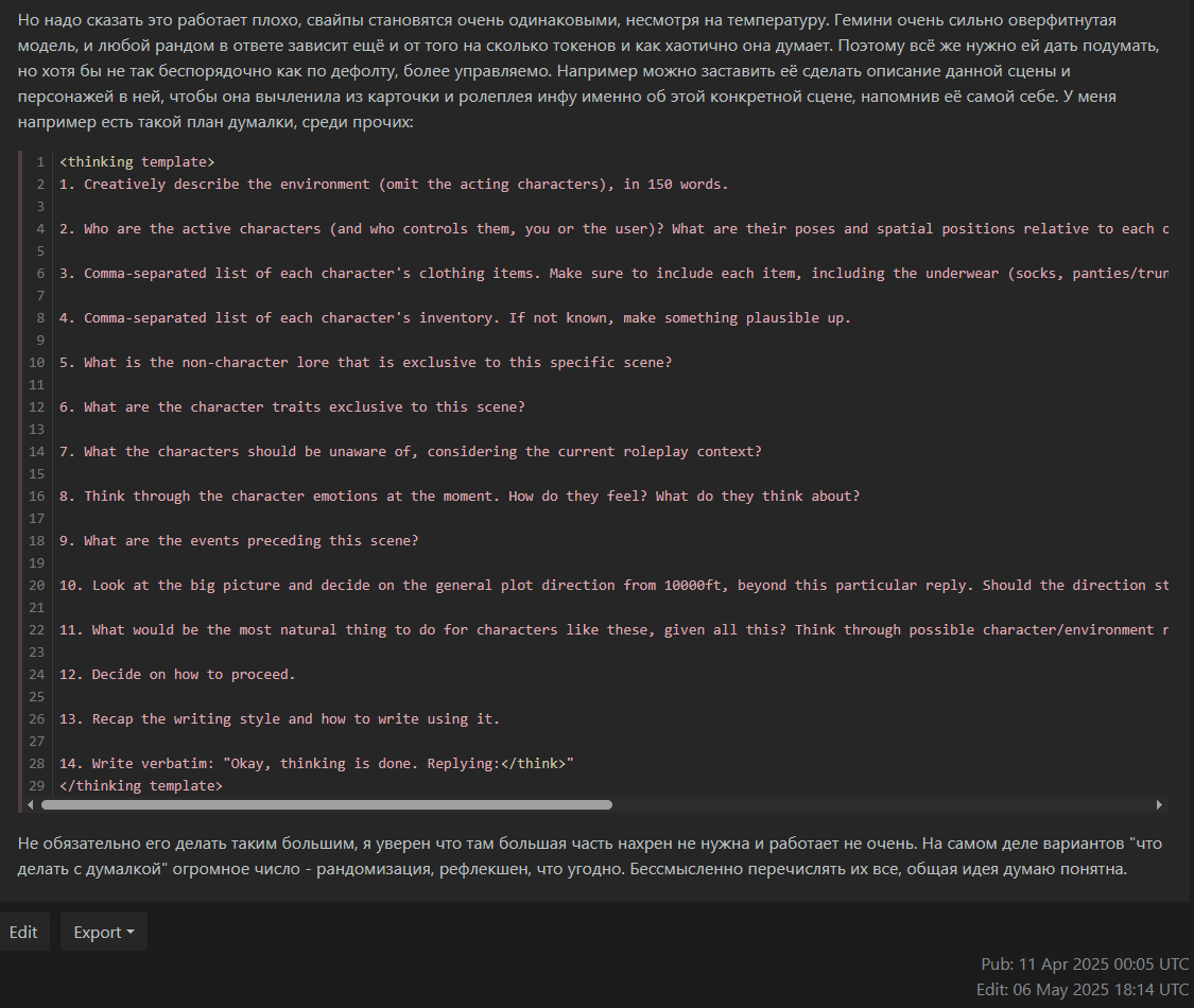 >>1375657 Да с какой такой-то? Ты же не сказал чего хочешь починить думалкой. По ссылке куча промптов-примеров, адаптируй к своему. >>1375658 >отключение думалки ведет к однообразным ответам То было написано вообще во времена первого снапшота 2.5 и я не 100% уверен даже что это так было. Выключай и тести на релизной. Все эти гайды должны быть толчком к экспериментам, а не вести за ручку.