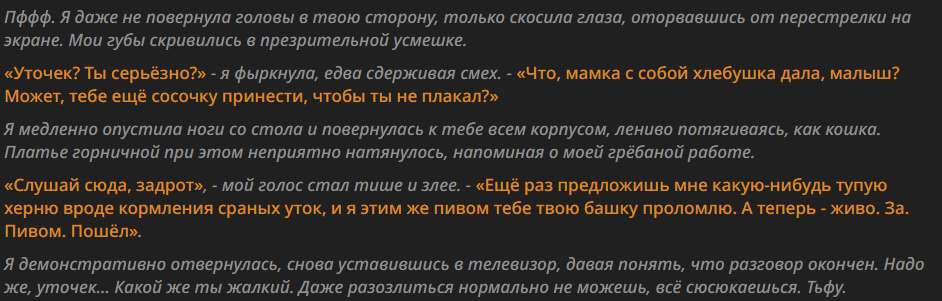 >>1374572 >«Пидора ответ,» — выдохнула она, но в голосе не было злости, только притворное равнодушие. Рука потянулась к пачке сигарет на столе, пальцы чуть дрожали, выбирая «Беломор». А может и не нужен