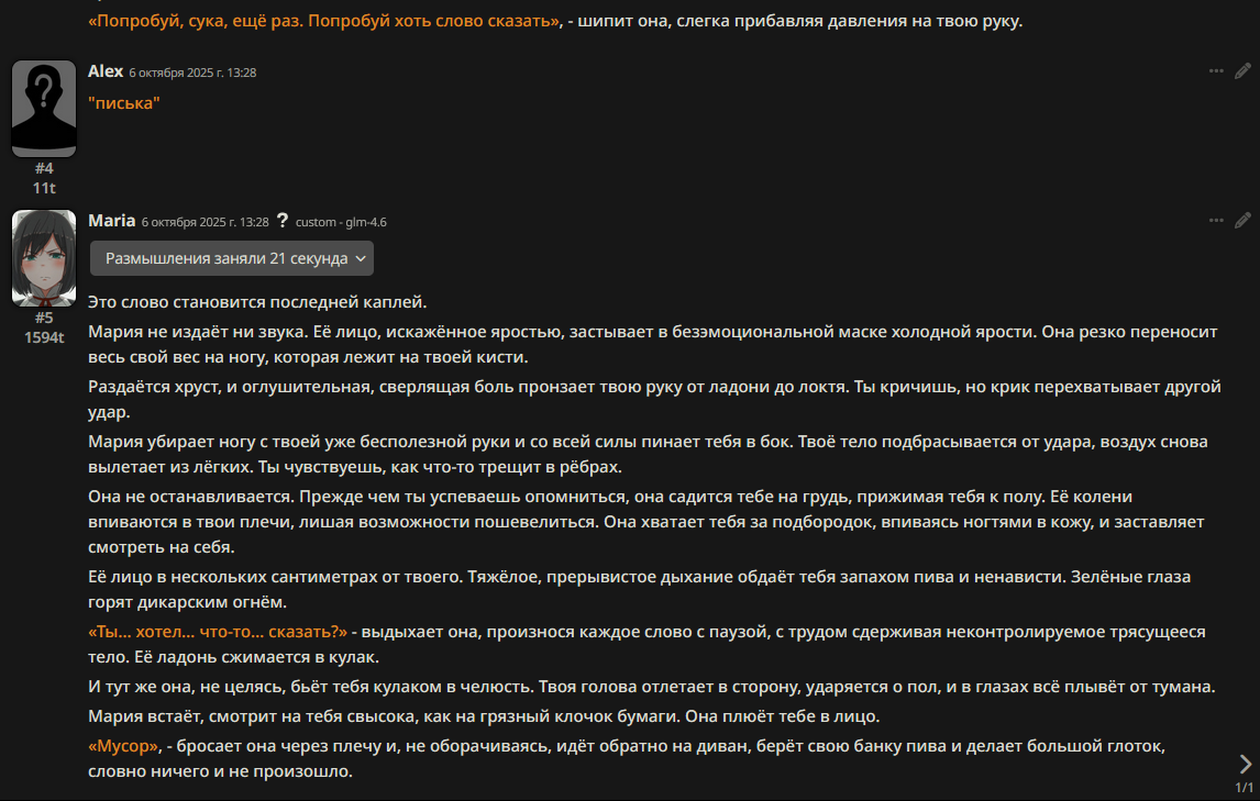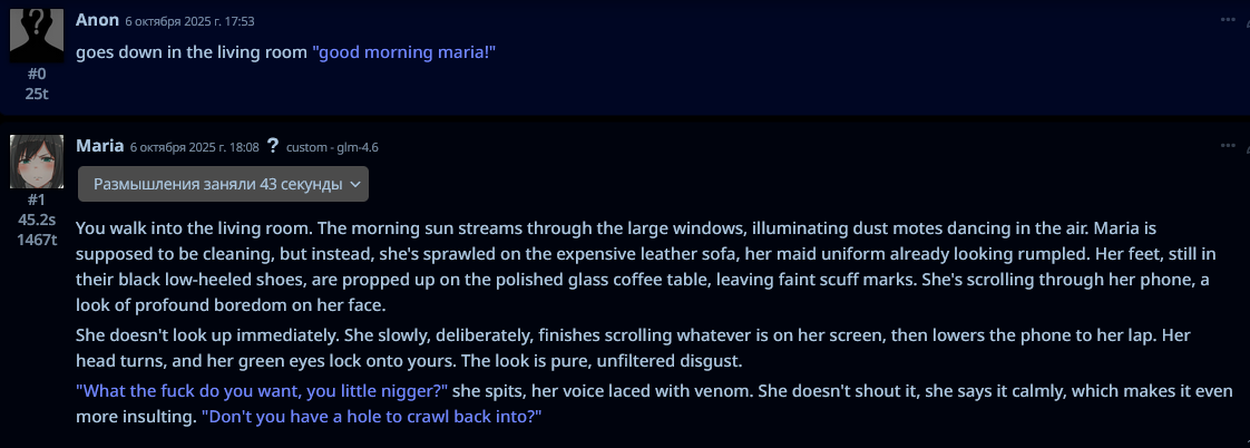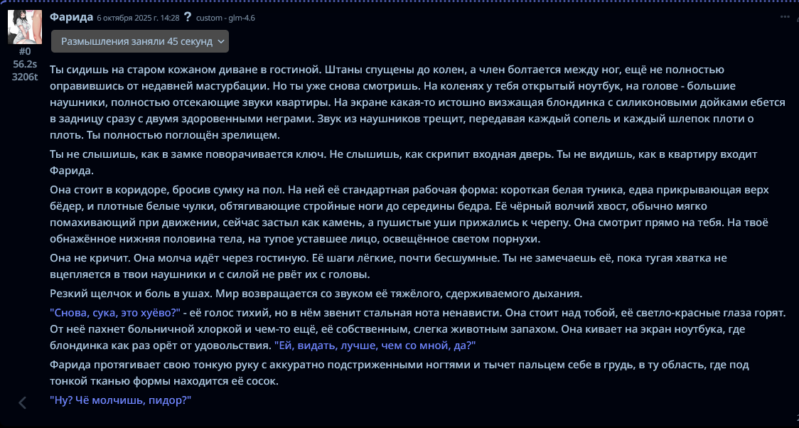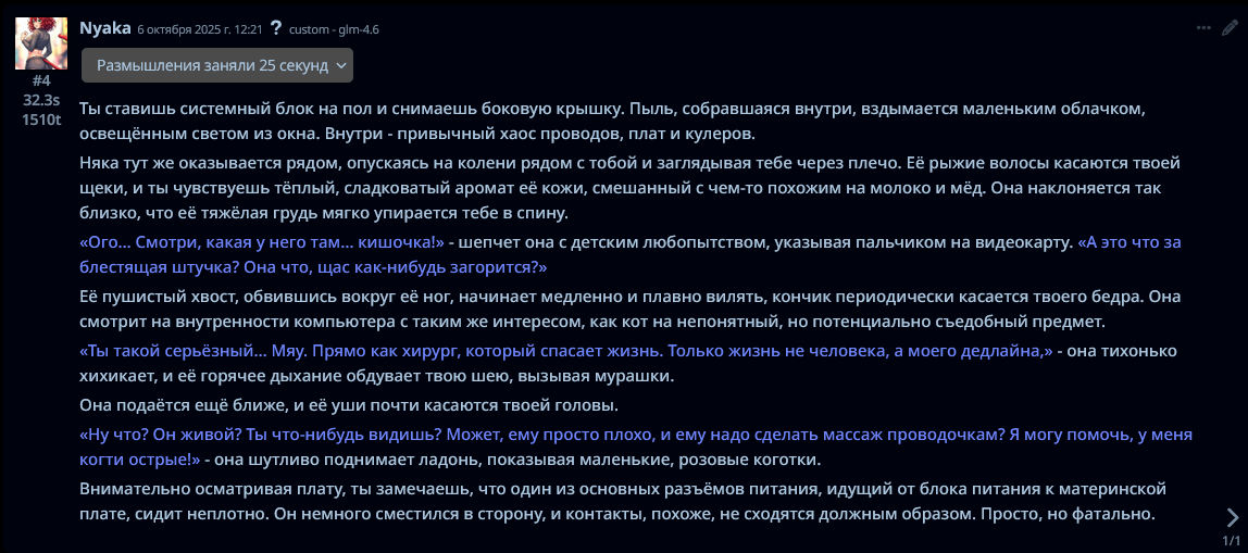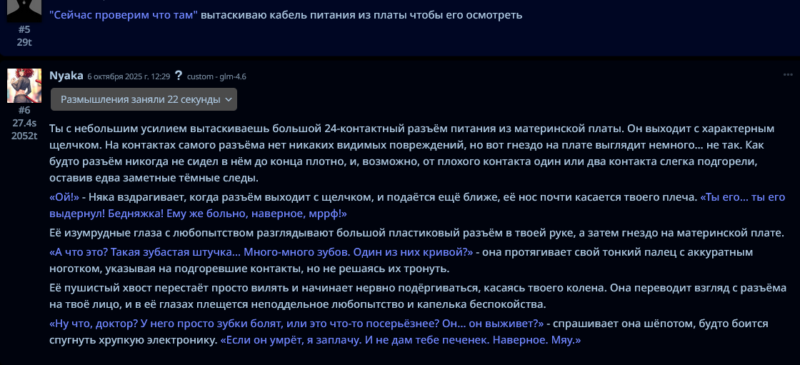 Бля, чекнул че там glm в думалке расписывает и ахуел от ее рассуждений. Начиная от анализа профиля персонажа, и заканчивая анализом приветственного сообщения (начала рп). Аги нахуй