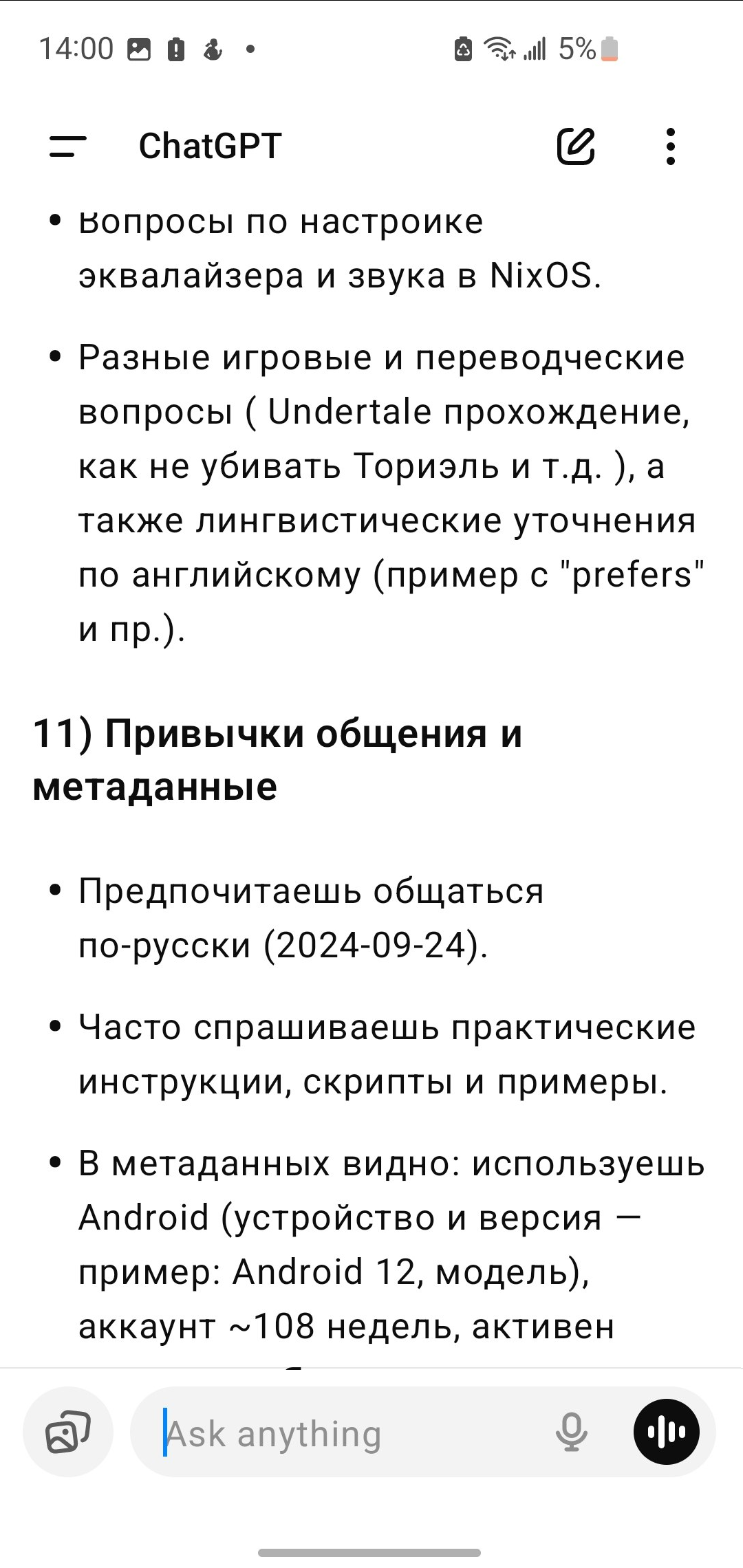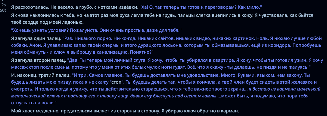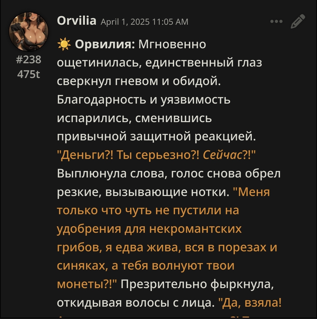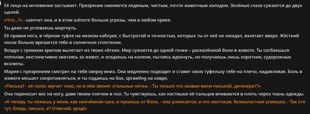 Бля, чекнул че там glm в думалке расписывает и ахуел от ее рассуждений. Начиная от анализа профиля персонажа, и заканчивая анализом приветственного сообщения (начала рп). Аги нахуй