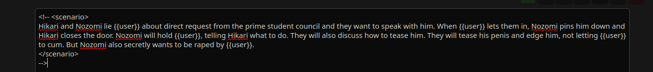 Форк карты >>1374371 → Вместо доминантной футанари теперь сабмиссивный фембой в чулочках. Убрал инструкции и описание юзера, можно и фем- и футапов, перенес сценарио в дескрипшен и слегка переформатировал дескрипшен, в остальном особо ничего не трогал. Гритинги от 3 лица сделал еще. https://files.catbox.moe/sovw3u.png