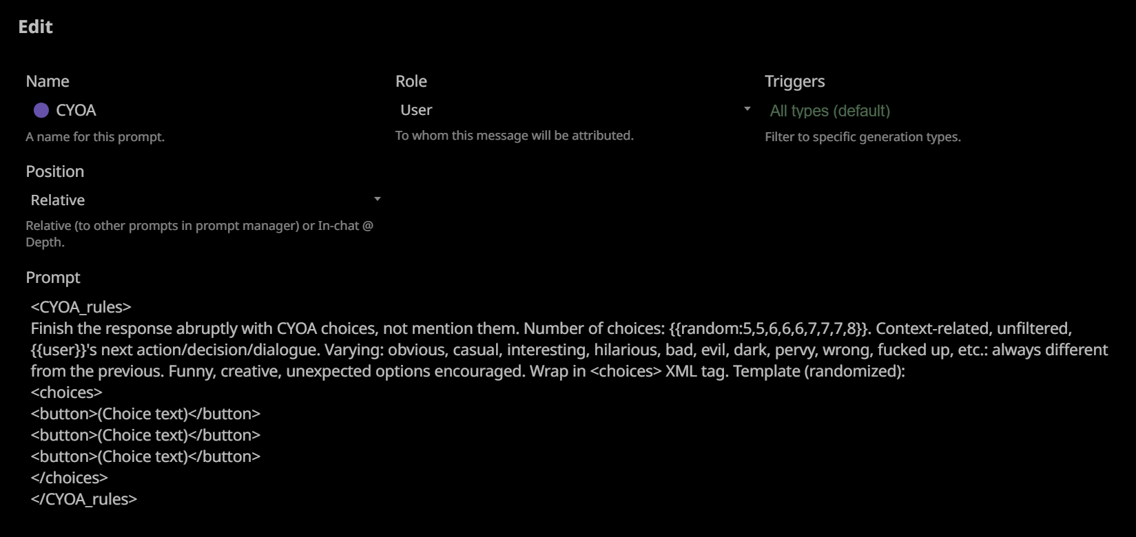 Аноны, вроде сделал всё по гайду вот тут: https://rentry.org/fancy-cyoa (CYOA и интерактивные кнопки) Играя на пресете Ремиксера, с целью добавить варианты ответа в диалогах. Но в пункте 2 он пишет (пик 1): Пример промта для CYOA блока. Я ставлю после истории от роли юзера например. А как это сделать? Я могу добавлять руками в конец сообщения от себя этот промпт и это работает (пик 2), но это ведь наверняка автоматизируется? Как это сделать?