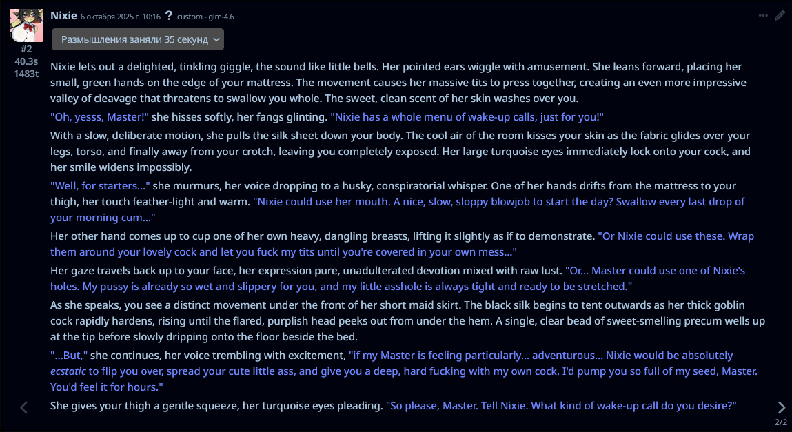 у глм 4.6 если что одни из самых сочных и подробных описаний секаса и фетиша, попробуйте только в системном хотя бы напишите что в момент нсфв нсфл описания должны быть супер подробными лол.