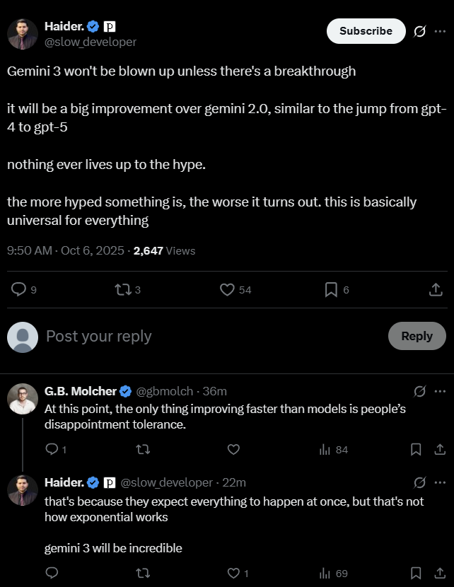 кто не понял, они хотят из гемини 3 сделать мелкую модель с большой думалкой, точно такую же как гпт-5, потому что эффективно в кодинге, и дешево в использовании. я поэтому вам и говорил изначально, не ждите ничего от гемини 3 хорошего, то же самое говорил про гпт-5
