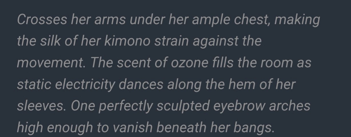 >>1376408 [char is char] [char is users mom] [infoblock в карточке на 10к токенов] [Описание юзера в карточке на 20к токенов] [пресет в карточке на 15к токенов] [Лорбук на 30к токенов с описанием зелья из озона]