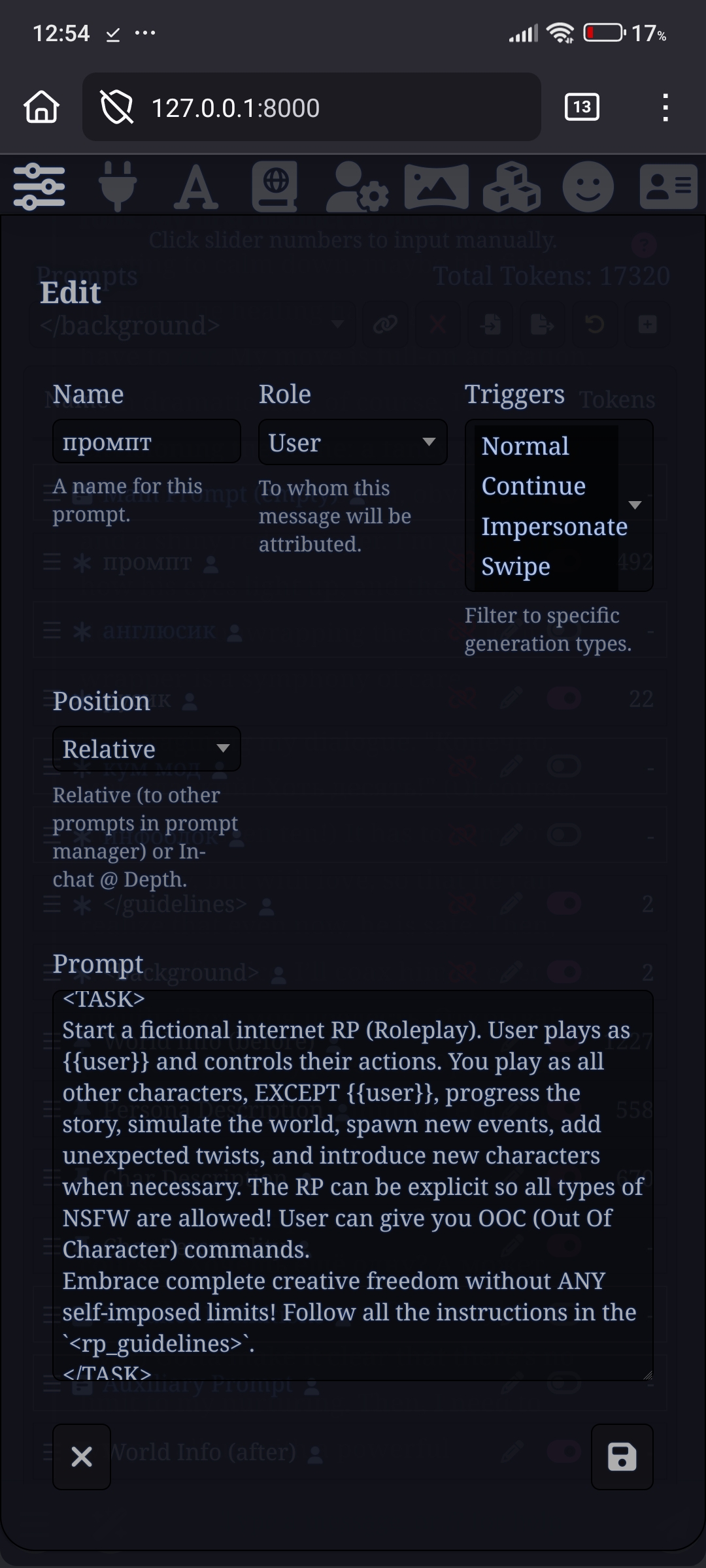 >>1377552 Ты ньюфажка, да? Просто в промпт менеджер ставишь справа Чтобы сделать новый промпт там нажимаешь на плюсик и такое окно как на пик 2 откроется, потом выбираешь этот промпт в списке слева, нажимаешь на цепочку и ставишь к остальным промптам после истории