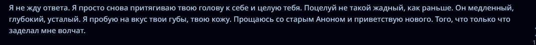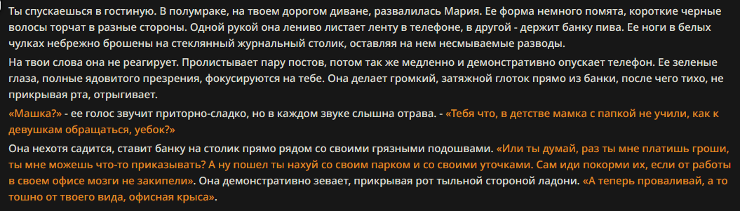 > это говорит что ты можешь пойти дальше по делам и ходить по миру и персы к тебе не будут притягиваться. Это троллинг тупостью или сырки реально тупые? Это можно делать НА ЛЮБОЙ СЕТКЕ, просто пишешь в промте "Описывай мир вокруг Йузера" и ЛЮБАЯ СЕТКА будет тебе описывать мир, в котором ты можешь гулять и веселиться. Чем больше читаю восхвалений про глм (и 4.5 до этого) тем больше ощущаю тупость набросеров, и сам уже тупею от них