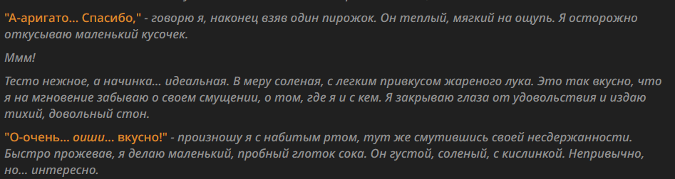 >>1377751 Может ещё от формата зависит? На скрине полутипографика с ёлочками, дефисами после (наверное регекс меняющий эмдеши) и точками внутри ёлочек (должны быть после), а с РП форматом с двойными кавычками "Речь." действие с точкой внутри как?