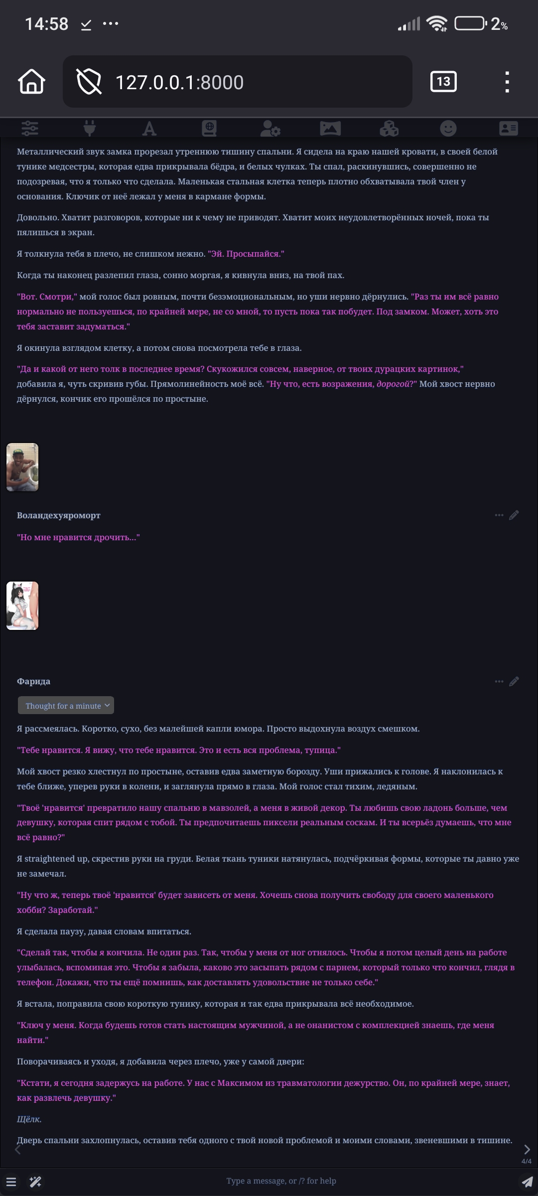 >>1376899 там главное чтобы он думал много, в конце сообщение от юзера ставишь типо подумай многа, вот об этом подумай, подумай чтобы диалоги были живыми, подумай о реалиситчности, у дефах карточки и т.д. и всё блять, как же она охуенно продолжает это пиздец, это пока лучшее что я видел после смерти гпт 4.5