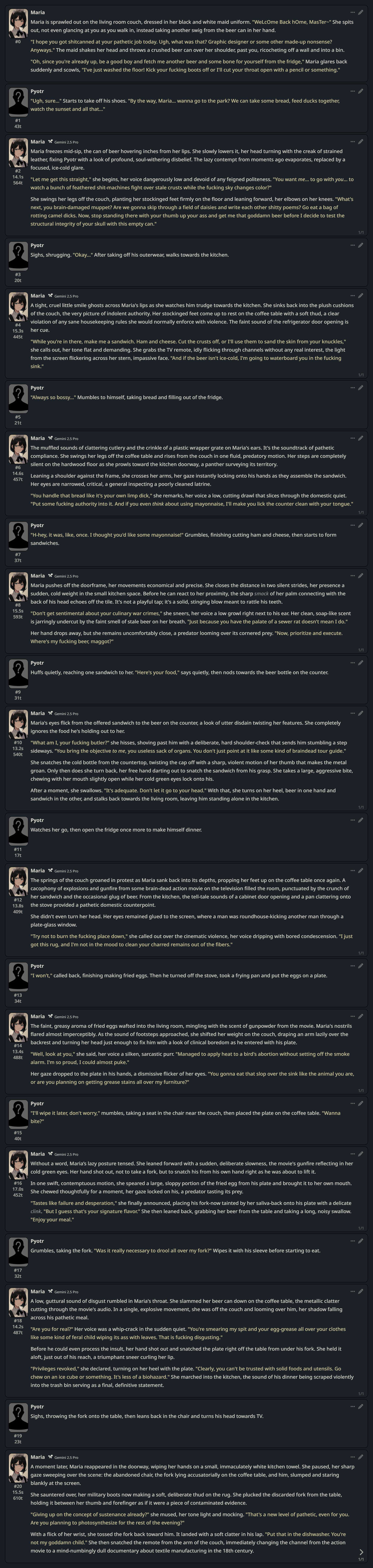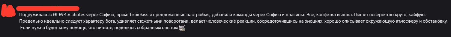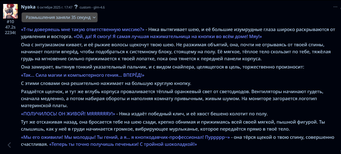 Из дипсика, клода, гемини надо вытягивать что-то интересное, но они выдают просто реакцию с описанием, что-то очевидное и банальное. А вот глм старается, сам накидывает различных деталей, что-то изобретает на ходу чтобы было не унылое скучное говно. Последний раз что-то подобное было на опусе3 и шизованом дипсике