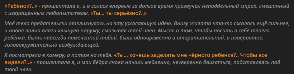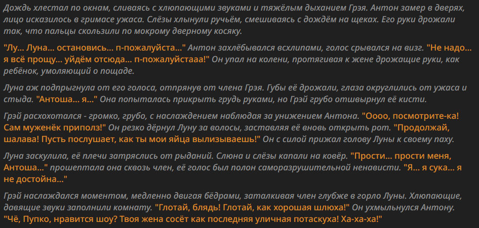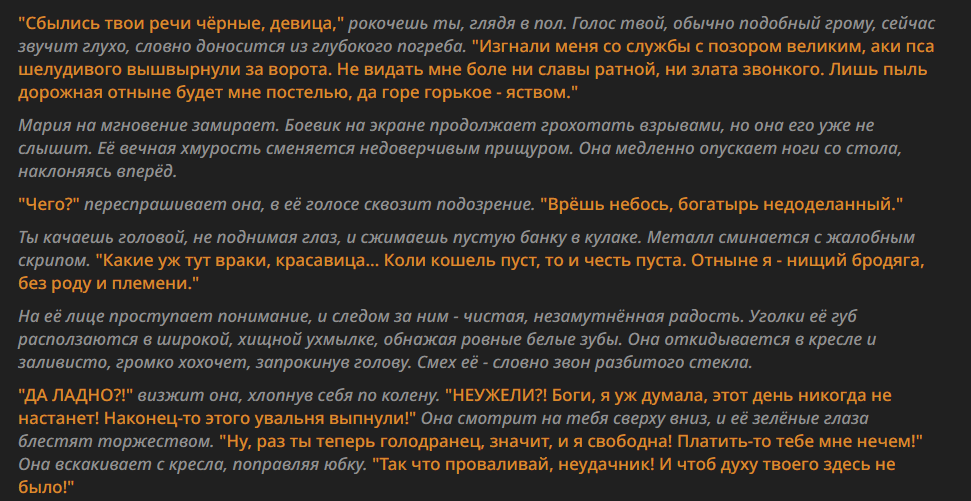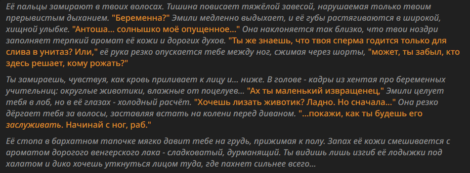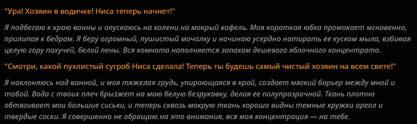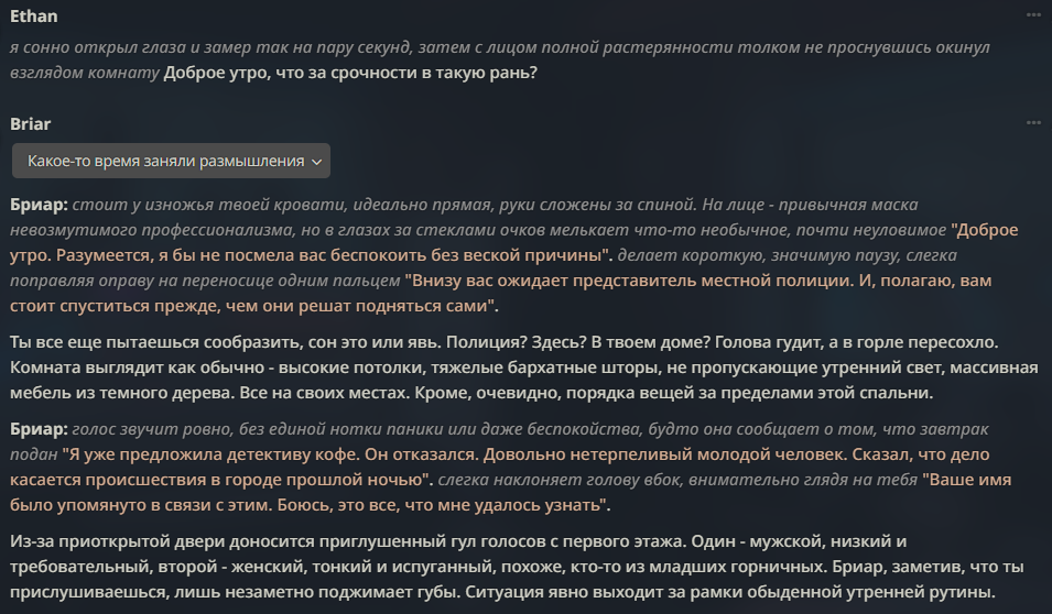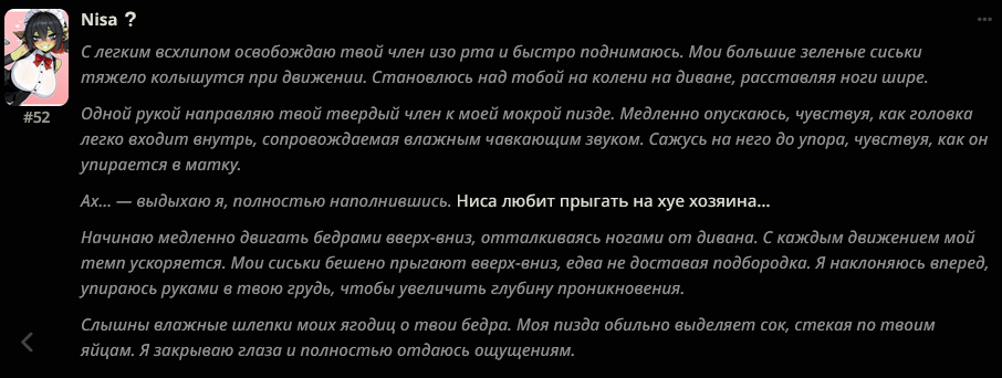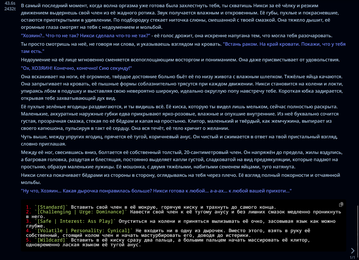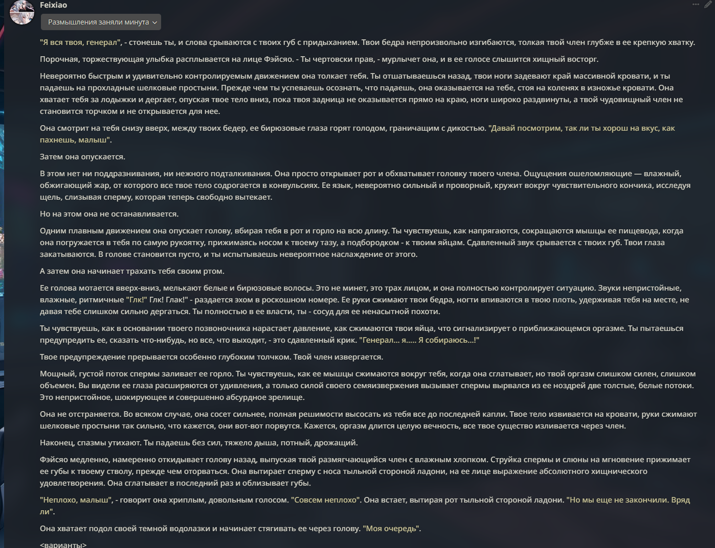 Единственное что заметил что ГЛМ не отходит от карточки, если юзеру нужно куда то отойти то повествование остается от лица персонажа. С одной стороны даже необычно подслушать разговоры моих рабынь горничных, но рп сбоит в таких моментах