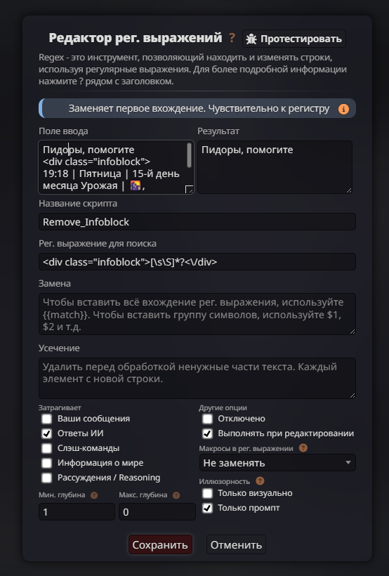 (звдчк) Структура пресета: Scenario - Description - Start, всё от юзера. Start это [Start a new RP session] для англ, [Начни новую RP сессию] для ру. - Семплеры: 1-0-0.8 - Инструкции не добавлял помимо этой, все нужные уже вставлены ботоделом. - Персону не включал, уже вставлена ботоделом. - В карте есть инжект от роли System с не обёрнутым текстом, который на Гемини превращается в кусок текста в одном из сообщений юзера (ассистента?), но я не трогал и ради интереса оставил как есть. Хоть он и связан лишь с первым гритингом (я играл на втором) и можно было бы удалить, перенеся в первый. - Чуб не поддерживает встроенные регексы, а ботодел в описание карты не добавил как чистить инфоблок, поэтому срём в контекст или пишем сами \n{0,3}>```[\s\S]*?>```.
