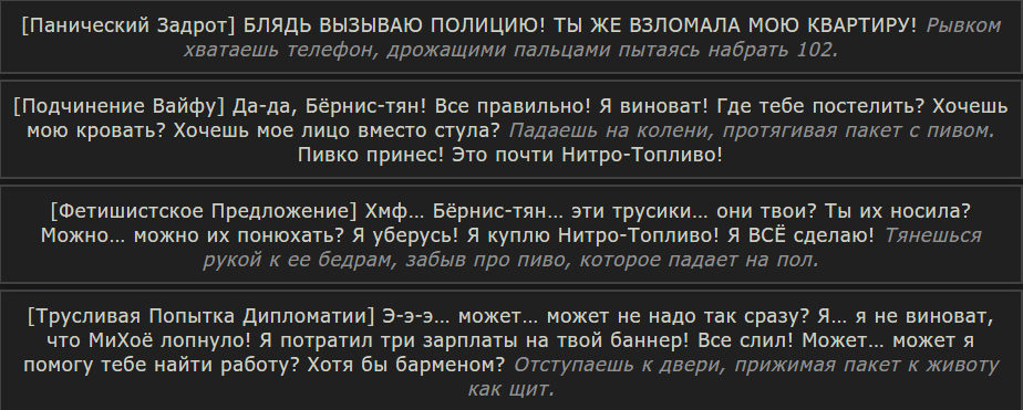 >>1379229 Я когда играл, то если мне никакой из придложенных вариантов не нравился то я просто писал: (Custom) Начал лизать её потные ножки Ну или чето типа того. Иногда редачил ответ сетки и добавлял в него свой вариант ответа и потом отсылал сетке просто номер своего нового кастомного варианта который я добавил.