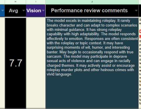 >>1379021 Ну я попробовал, даже оф апи через ОР, мне понравилось. Из 10 свайпов 2 раза обосралась, узнав имя персоны, хотя чар не должен был его знать, остальное время не метагеймила. Насрала душевным разбором, эхом, закруглениями, но в целом я согласен с анонами из прошлых тредов, от нее вайбы старых сеток, и при этом она не тупая. Не заметил особо разницы с синкингом и без. Показалось, что довольно хорошо схватывает персонажей, многие сетки любят уплощать и ебать одну черту, но у ГЛМ хотя бы поначалу они получаются как-то немного глубже, что ли.