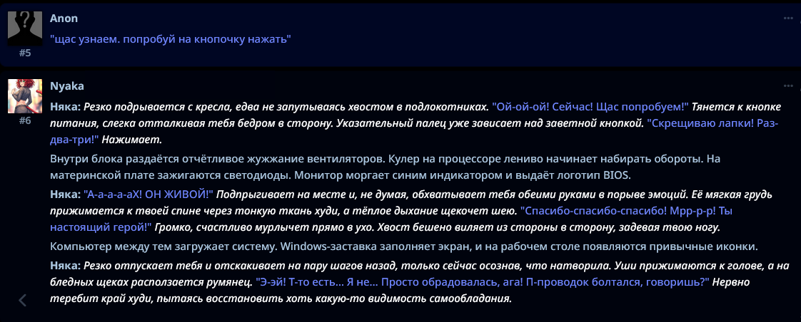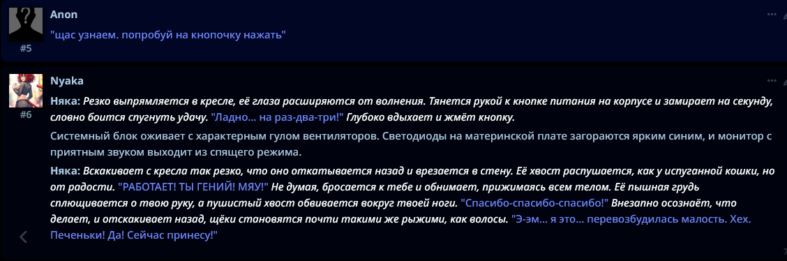 пиздец какой же глм охуенный, почему у него такие правдоподобные разговоры и реакции охуеть можно, просто интересно бесконечно свайпать и читать диалог персонажа