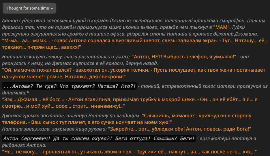 >>1379524 Лично для меня все упирается в когеретность, диалоги и сочный отыгрыш персонажей. Когерентность сопоставимую можно получить на гпт и даже с некоторым сейфгардами на китаекале но вот диалоги с отыгрышем нормальные есть только на нем. Ну еще может на старом дипсике, но в его случае очень коряво, грубо и со вкусом шизы которая приедается. Разумеется, сочность отыгрыша сильно упала после опуса, но все еще нигде нет выше. Да и точность отыгрыша, которая сильно бустанулась после перехода на сойнеты тоже лучшая из моих личных впечатлений. Важно понимать, что под диалогами я подразумеваю не ахуительно сложные и заумные тарантиновские конструкции. В клоде дохуя лупов и остоебенивших тропов которые меня ультразаебали (например хуйня формата х: утверждение у: х! х: what? It's true или I hate it - you love it), не оригинальность идей, не отсутствие репитативности а понимание моделью какой фетиш активен в сцене и какими именно словами в какой именно степени (без перекоса в ультраугар или сою) его лучше всего удовлетворить. И если что я не клодошиз, постоянно тестирую новые сетки и верю в то что гемини 3 отчасти по крайней мере сможет превзойти сойнет.