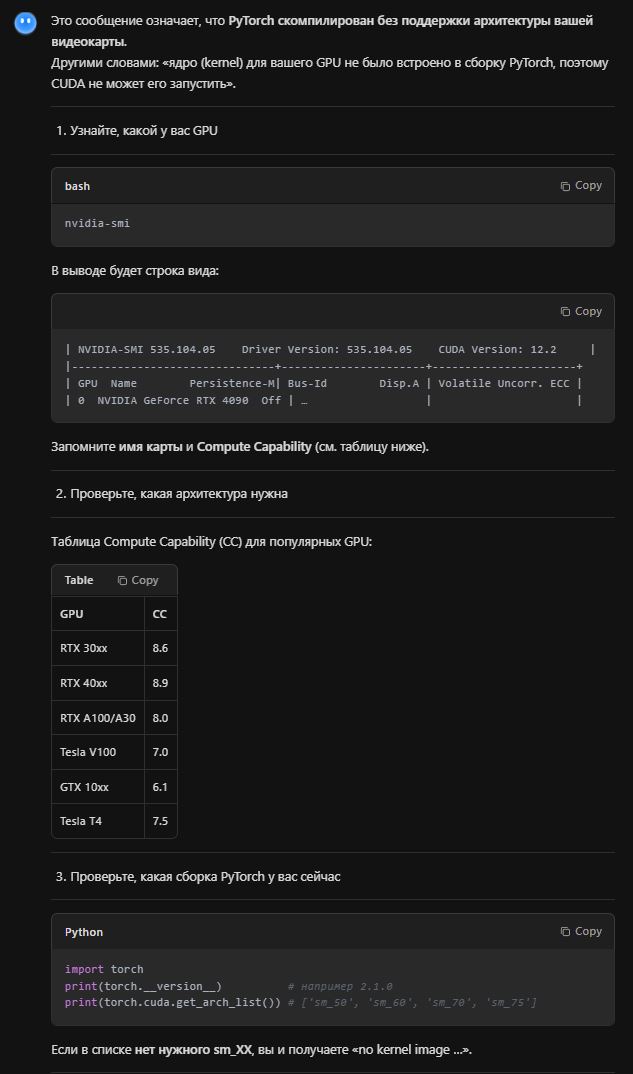 Как это исправить? RuntimeError: CUDA error: no kernel image is available for execution on the device CUDA kernel errors might be asynchronously reported at some other API call, so the stacktrace below might be incorrect. For debugging consider passing CUDA_LAUNCH_BLOCKING=1. Compile with `TORCH_USE_CUDA_DSA` to enable device-side assertions.