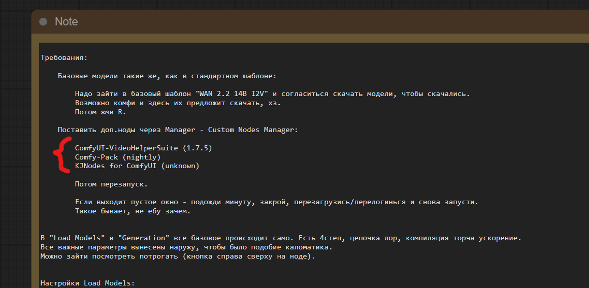 >>1383685 Да, я, похоже, разобрался. Ещё раз переустановил этот плагин для импорта воркфлоу из видео, и, внезапно, заработало.
