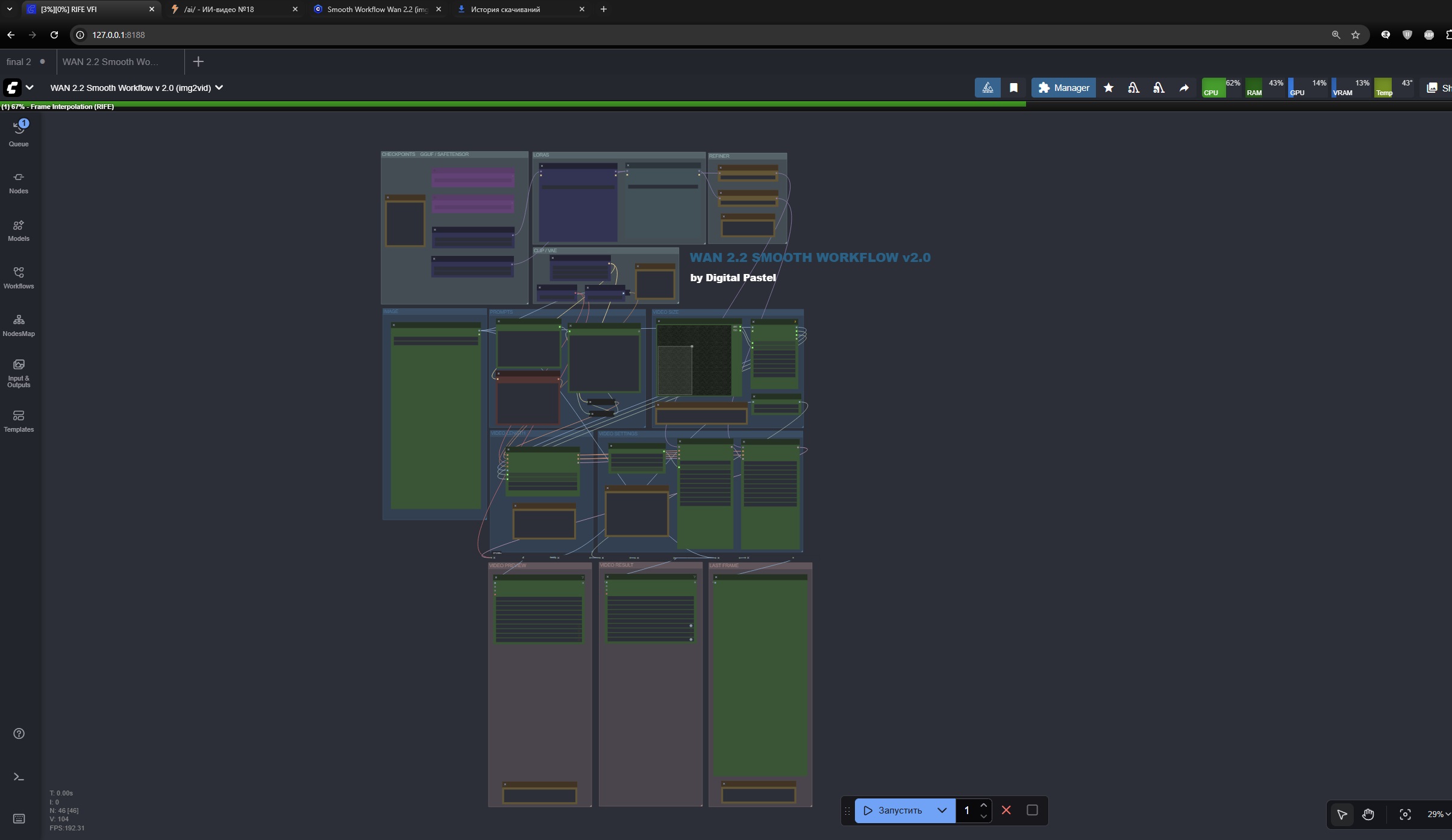 >>1400208 те проще взять готовый вф с цивитая или из треда с видосиками, вангую у тебя файл подкачки стоит по умолчанию. Нужно выставить гигов так по 50 для начала. также возможно у тебя полноценная модель скачалась автоматом, нужно скачать FP8 scaled.