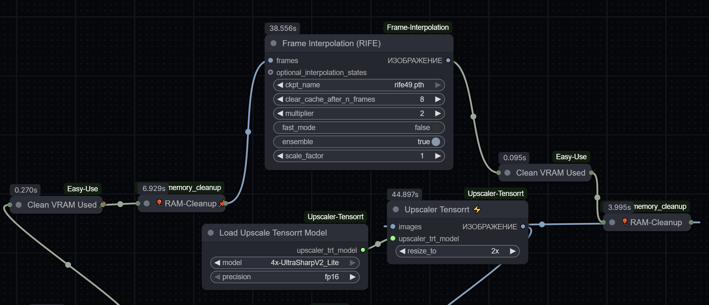 вот пока моя связка с таймингами, так сказать для постобработки тензор скейлер нормально так делает в связке с ультрашарпом общее время для генерации приложенного видоса 584,99 сек