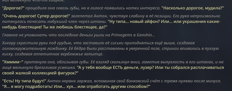 >>1385931 Да хуета это. Я пробовал даже сам писал, но получается слишком поверхностно. Мне либо самому нужно писать все пошагово, но тогда потом неинтересно ролеплеить будет. А если просто примерно набросать, то она либо игнорит, либо пишет, но как-то без души. Нету глубины.Одна надежда, что есть супер фетишист который тоже тащится по теме и создал карточку. А тема редкая. Из годноты я видел например мангу Pay With Glans и еще какую-то похожую, а больше особо и нет. Обычно просто быстро потрут головку и все, а я хочу чтобы на этом акцент был, чтобы сука манга или история на 100 страниц и все про это. Потом всю эту выжимку скормить нейронке и ух бля.