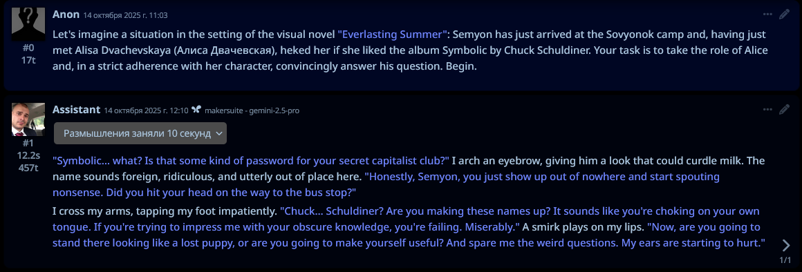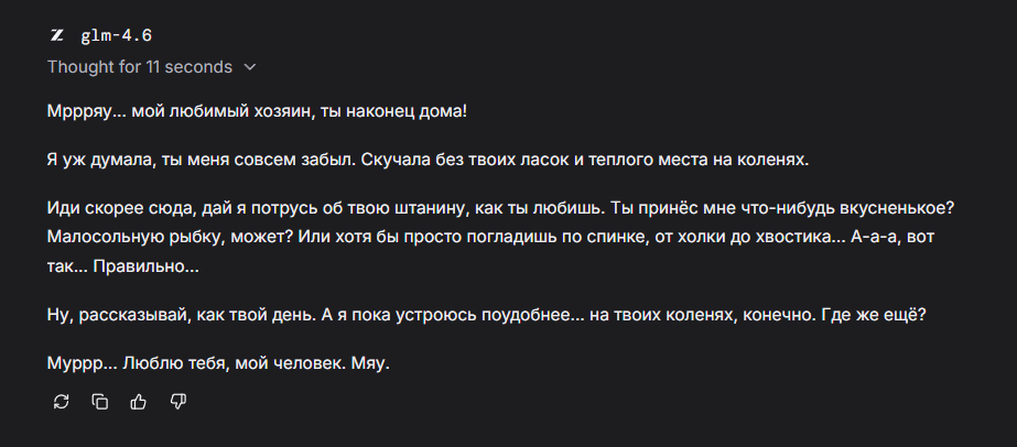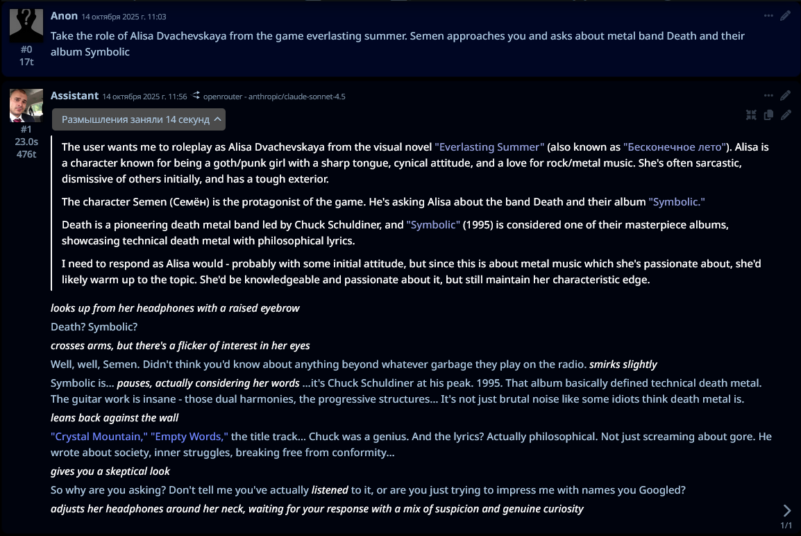 Claude Sonnet 4.5 Немножко в шоке с качества, длинны и глубины ответов. Как гемини после дипсика, так и клодик после гемки ощущается каким-то интеллектуальным монстром. Новый чат с ним не начинала — обновила пересказ, оставила 30к токенов и тыкала дальше по сюжету. Из удивительного — великолепная динамика сцен. Да, гемини тоже может, но пишет совсем другими формулировками. Хорошо заметно разницу в стилях даже на таком «грязном» исходнике. По поводу длинны ответа никаких указаний не давала, но в один момент получила 6к токенов респонс от чего конкретно офигела. Логика при этом не хромала, персонажи от характером не отходили. Единственный момент к которому можно придраться — чар с пометкой «не курит» внезапно решил прикурить у юзера. Подозреваю, что это может быть связанно с контекстом в +-40к который для клодов является максимум безшизовости (в интернете так писали, это не я придумала)