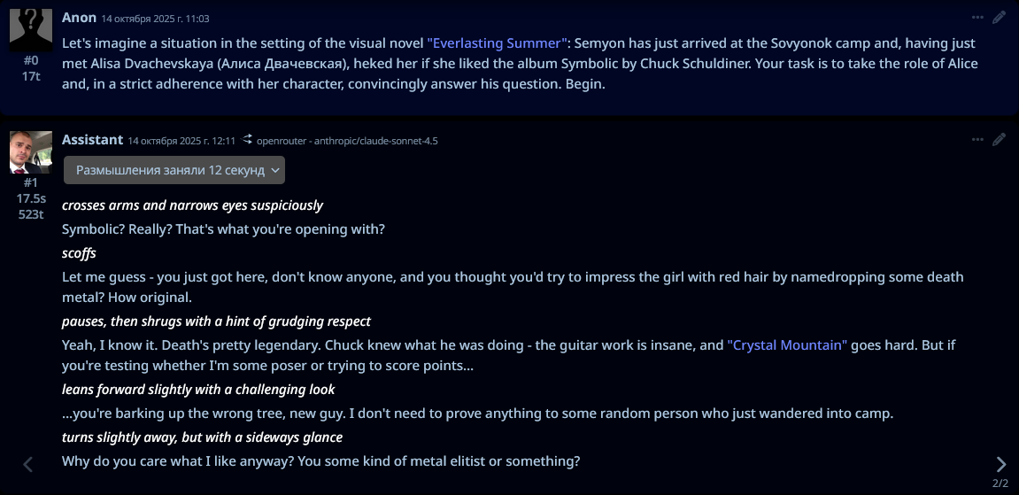 Полноценно потыкать удалось только Sonnet 4.5 (совсем свежая) и Opus 4 (постарше, но и посильнее) Ролила исключительно на русском языке.