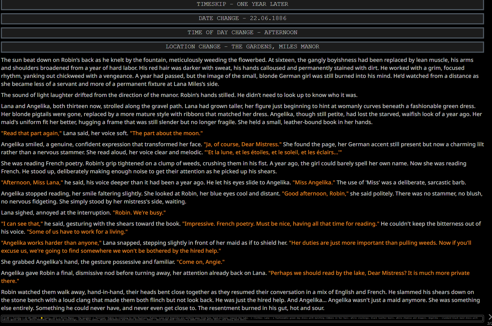 >>1387880 >>1387878 RandomWords есть. Я не промтер.. Мне сетка вот так подсказала: Pick 2-3 words from the available list: ({{RandomWords}}). DO NOT interpret these words literally. Instead, you must abstract their core meaning, symbolism, or implied concept (e.g., 'Mirror' = Self-reflection or Secret, 'Key' = Solution or Obstacle, 'Storm' = Conflict or Change). Use these abstracted concepts as the foundation to create a fresh, unique, and compelling new event for the story, ensuring it actively advances the plot. The original RandomWords must not appear in the reply! Events should be seamlessly incorporated into the next narrative segment without breaking the cinematic flow.