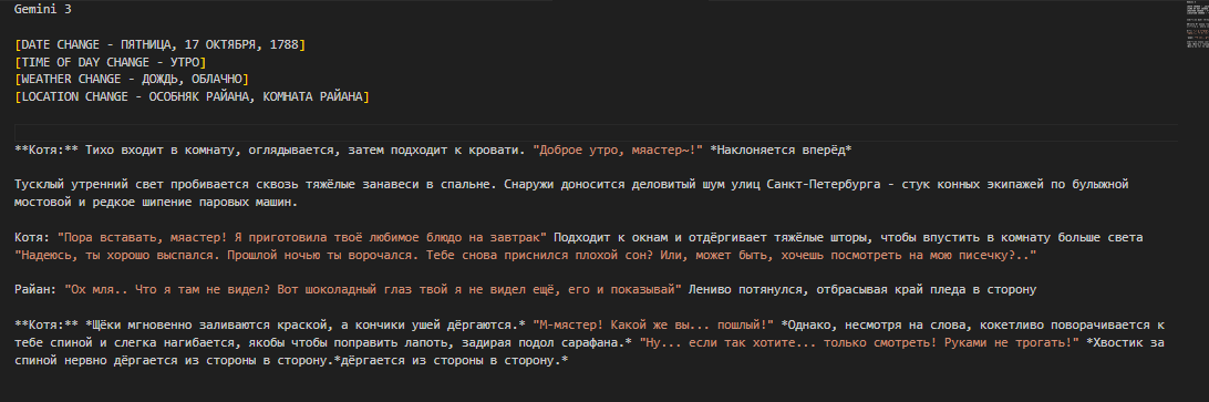 Рпшил нсфв с пробелами к сожалению, ибо фильтр Пресет небольшой, без гашения эха, минимальный пресет ремиксера (всё говно вырезано кроме бана слов, мне так больше нравится) Аполоджайсов не было (пока что) Озона не было (но и Рпшил мало) Пишет как клод. В чём суть - не нужны инструкции на анти-эхо. Кто не понял до сих пор и считает меня шизом - объясняю. На гемини 2.5 Эхо было везде, что в что в нарраторе что в "". Как это выглядело? Нарратор: повторяет в своём описании действия персонажей. Действия: реагирую на действия юзера, увидев как юзер, после действий юзера и тп. В спиче думаю даже объяснять не нужно Эхо почти нет, что в действиях что в нарраторе, в спиче есть но не лупится (40-50 сообщений) Вывод конечно же делать нельзя, нужно ждать выпуск в народ, но пока скажу что это не крутая модель, а лишь очередной "глоток свежего воздуха", который станет спёртым говном уже через неделю - две