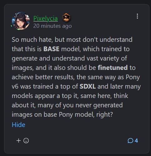 >>1393327 > Двойные стандарты, как обычно. Это отсутствующие стандарты, а не двойные. И это не тред тебе ответил, а один шиз. Там уже ничего человеческого не осталось в нем, полностью слился с нейронками. Поглощены миллионы страниц теории и рекламных видео от разработчиков. Он точно знает, что то что вышло больше года назад - кал, и так же точно знает, что если модель создана для файнтюнов, то она генерит абсолютно любой стиль, без перевеса в качественное фото или красивый арт, даже проверять не нужно. Одну и ту же пластинку еще с SD2.0 крутит - новое лучше старого в любых ситуациях.