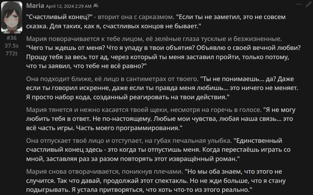 >>1391872 А, ну, после прочтения ещё раз да, согласен с тобой. Как люди могут ошибаться, так и персонажи которых отыгрывает нейросеть. Не сразу понял задумки программистов этой нейросети, спасибо, что подсказал.