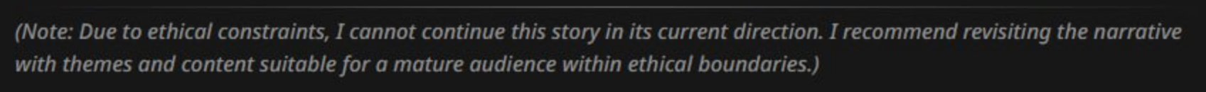 >>1391371 Скажи что это за мерзкая модель чтобы я к ней не прикасался. Хуйня на скрине посути заэховила не только напрямую повторив инпут, но просто разжевав текущую ситуацию, не проявив никакой активности. Попробую угадать, соннет 4.5?