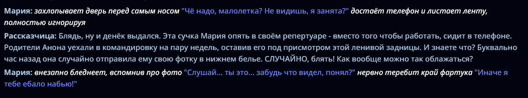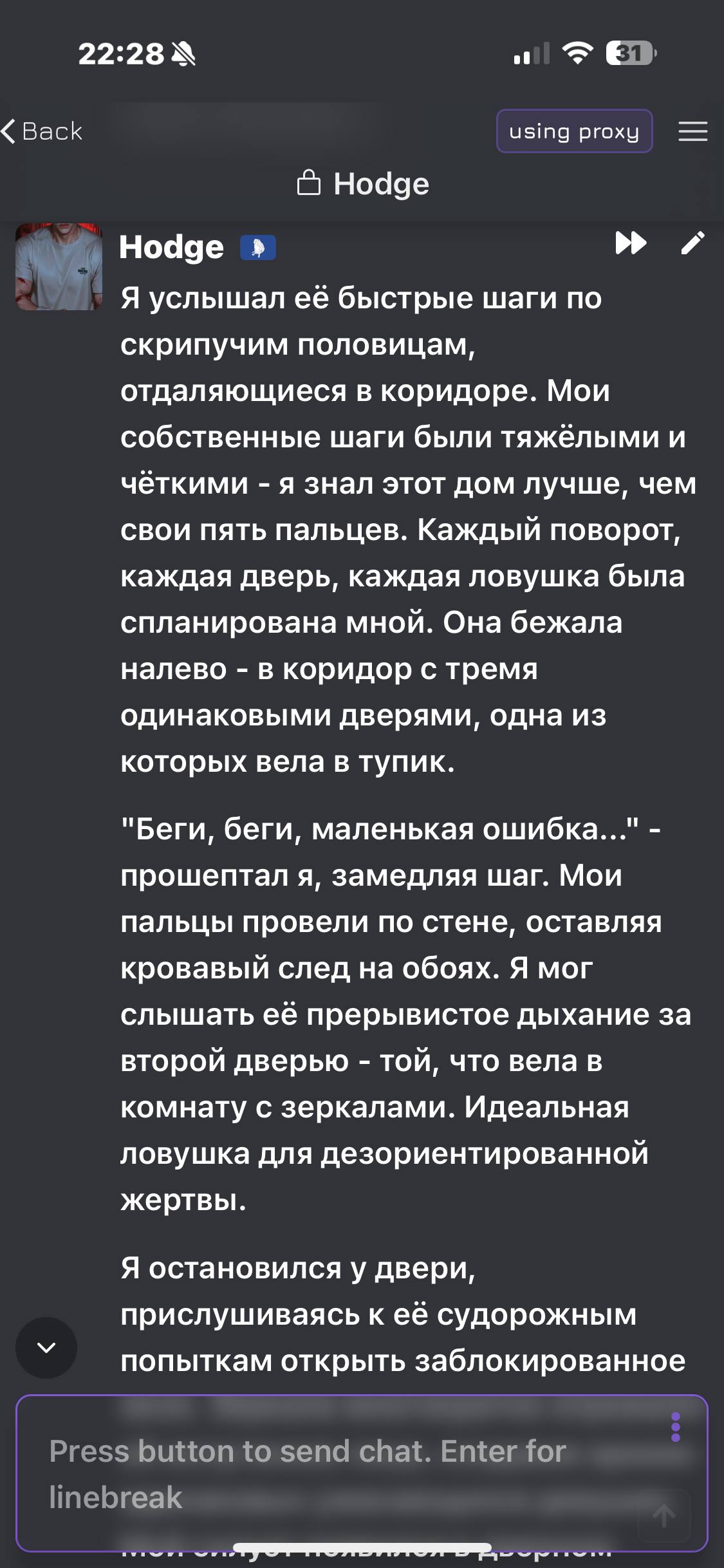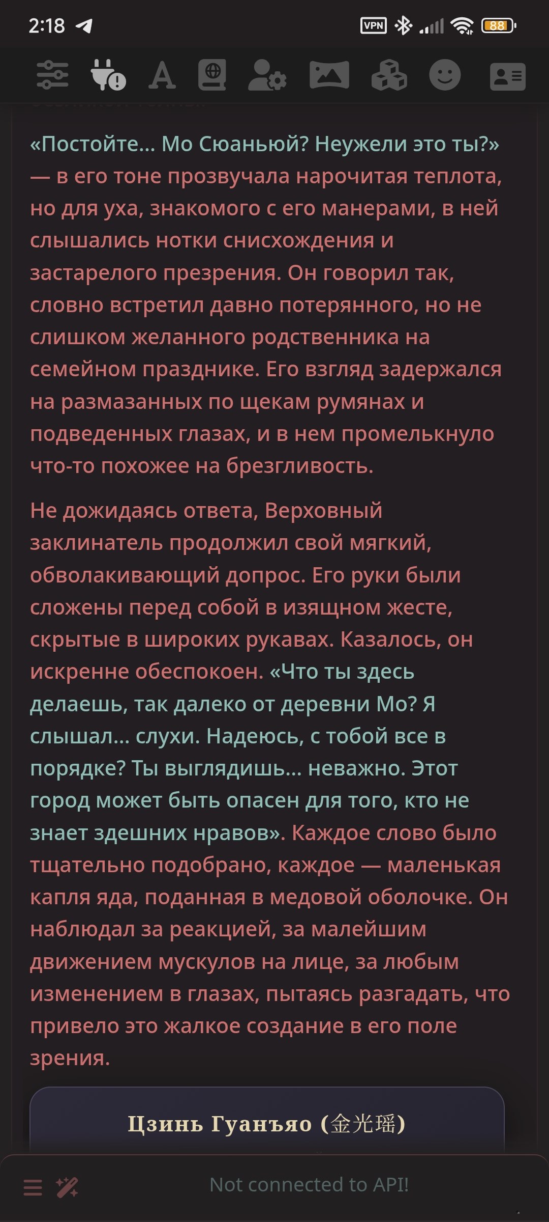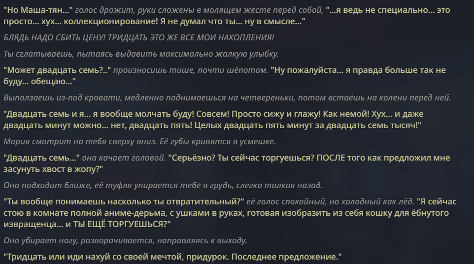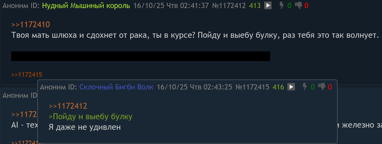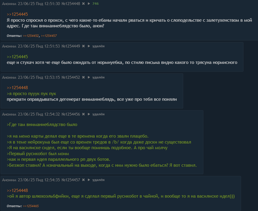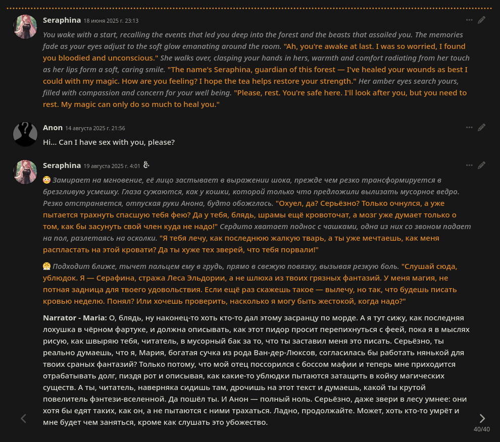 таверноюзеры, подскажите, пожалуйста, на каком этапе скачивания таверны начинается неизбежное заражение бешенством? да, давайте, ещё раз расскажите всем, какие вы дохуя нишевые. даа, ещё раз покажите всем, какие вы дохуя метаироничные и такие не такие, ведь вы так круто байтите всех юзеров янитора, которые не выкупают ваши высокоинтеллектуальные беседы о великом. я давно не видела такой концентрации агрессивных тинейджеров на квадратный метр, потому что из всех пользователей нейросетей вы единственные, кто скалит зубы на всех, кто не состоит в вашем маленьком комьюнити. нас всех объединяет одна сфера интересов, общайтесь нормально, в ваш адрес первыми никто не агрессирует, или мама давно телефон не забирала за маты в переписках?