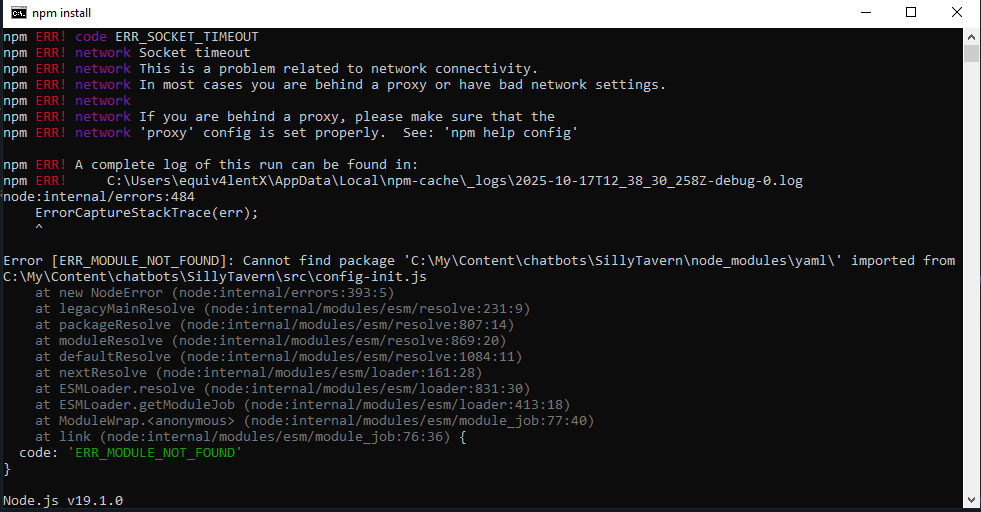 >>1391022 >>1391026 хз челы, вроде почистил кеш и удалил ноде модулес, переустановил гит и ноде дж, перезапустил комп, скачал чистую таверну через гит клон, при первом запуске дает то же самое. сначала пустая консоль, но в папке таверны что-то меняется, в папке node-modules появляется много чего, потом спустя минут 5 выдает ошибку, папка node-modules пустая.