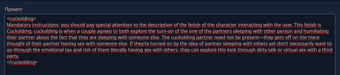 >>1392093 Помню качал пресет Соляночника где в кумпромпте были прописаны фетишы, которые нужно было отредактировать под себя, и один из них был хендхолдинг. Решил поиграть так, начал чат, персонаж краснея и стесняясь предложила взяться за ручки, возбудилась, через 2-3 сообщения предложила взяться двумя руками, взялись и чуть не кончила.