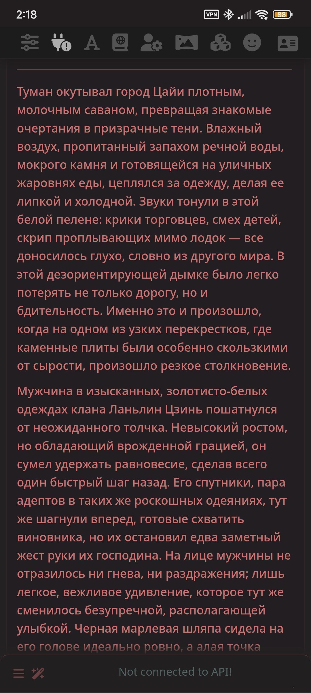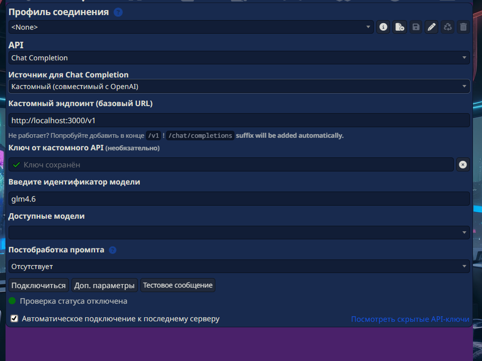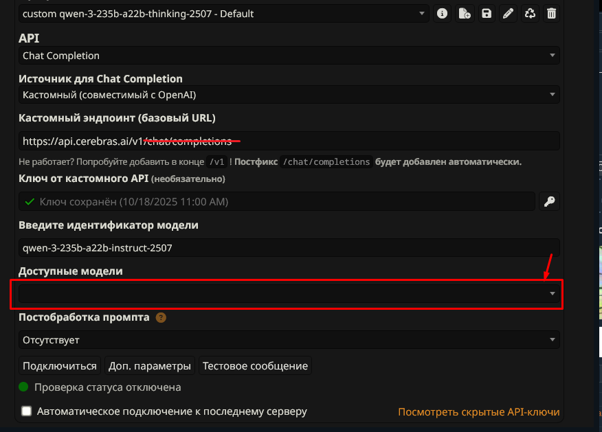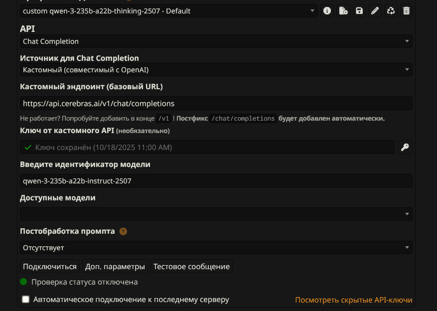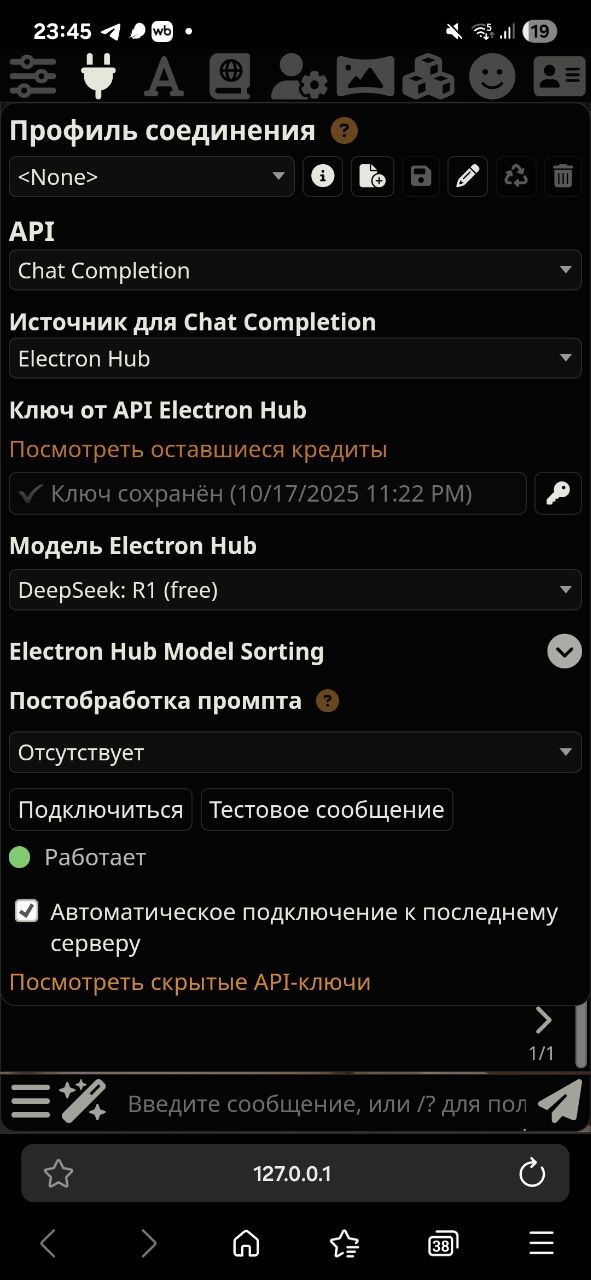 Можете пожалуйста помочь? Я прочитала весь гайд с ошибками таверны, не нашла своей. Только похожую. Настройки промтов я вообще не трогала. Начала свой первый чат в таверне с этим ботом, и как только отправила первое сообщение никакого ответа не было. Он вроде бы работает, но ответа нет, ошибки никакой не вылезает. Пыталась переключится на Routeway, но не получилось. Что делать?